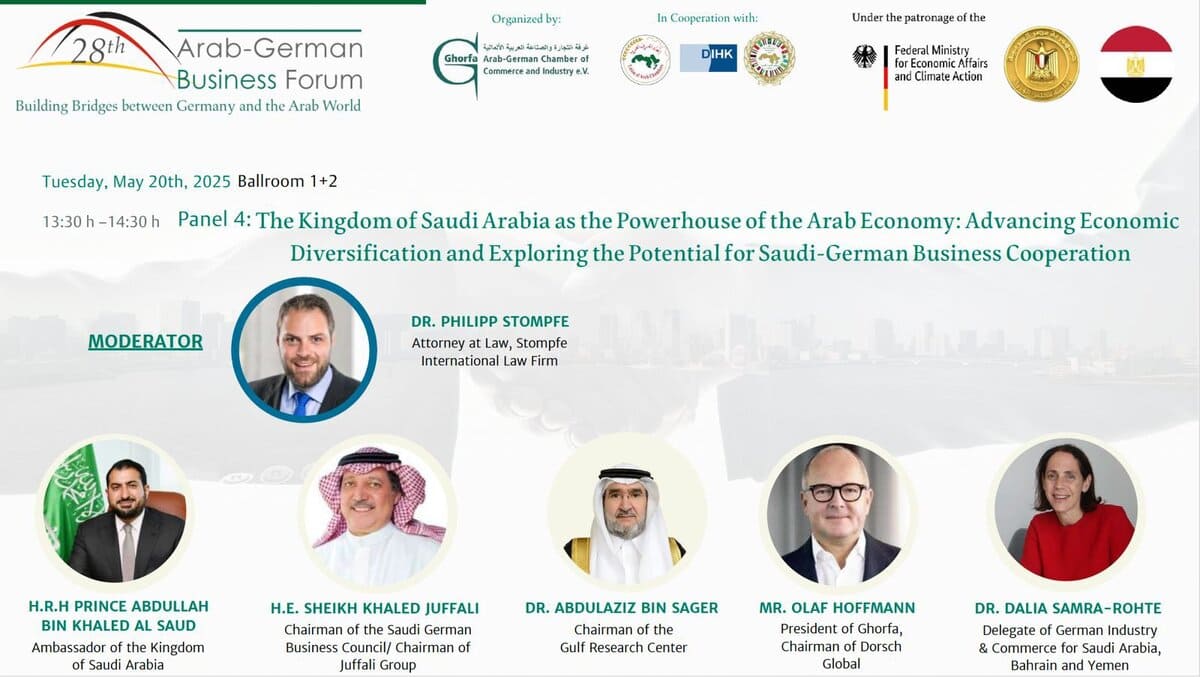 Dr. Abdulaziz Sager, Chairman of the Gulf Research Center (GRC), participated as a speaker at the 28th Arab-German Business Forum organized by the Arab-German Chamber of Commerce and Industry @Ghorfa_Germany , in Berlin on April 20, 2025, in a session on “Saudi Arabia as the Powerhouse of the Arab Economy.”