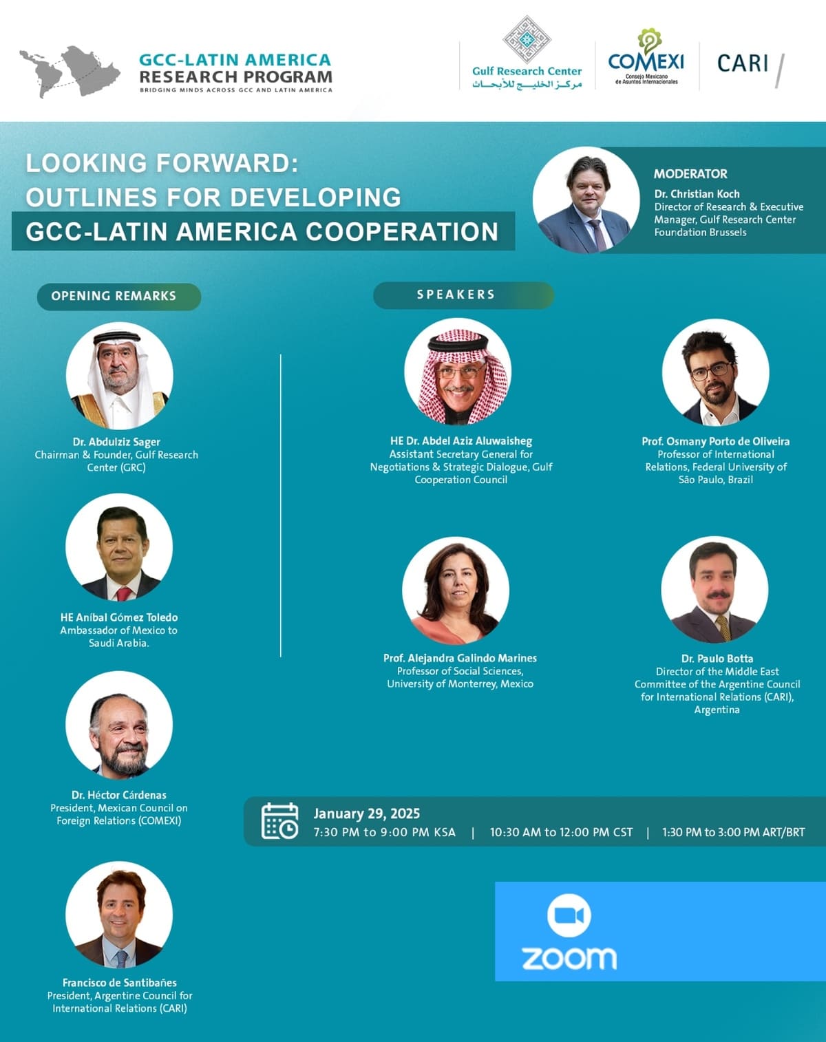 and economic trends. However, the scope and impact of this partnership remain underexplored in academic and policy discourse. Looking forward, this webinar seeks to catalyze a forward-thinking dialogue among experts aiming to uncover actionable strategies to amplify cooperation and address emerging challenges while fostering deeper engagement between these regions. Questions to be addressed: 1. What are the key drivers of GCC-Latin America relations in the current global context? 2. What is the view from both the GCC and Latin American states in terms of moving forward and developing cooperation? 3. How can both regions leverage their comparative advantages to enhance trade and investment? 4. What role does energy cooperation, particularly in renewables, play in shaping future ties between the GCC and Latin America?