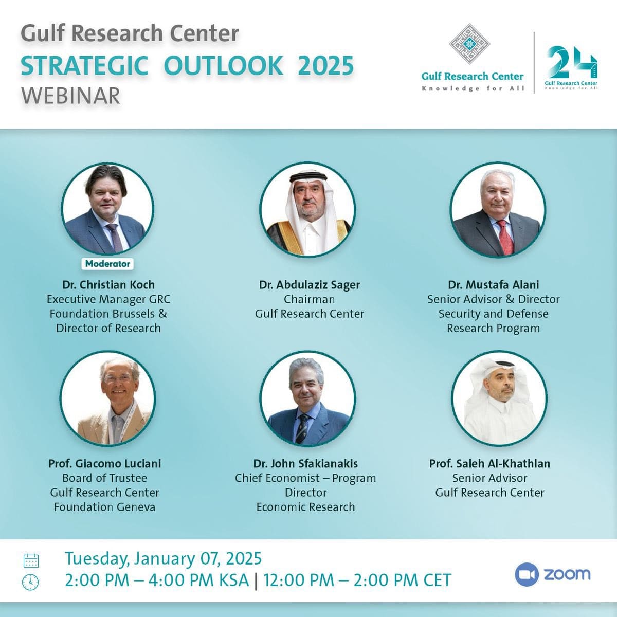 The ‘Strategic Outlook 2025’ the GRC aim to discuss the possibilities, emerging trends, and examine key priorities shaping the Gulf region's future, including regional security, economic diversification, and the development of international partnerships.This webinar aims to address the pressing challenges, and identify untapped opportunities for fostering regional stability. ➡️You can register in advance for this webinar under the following link: https://grc-net.zoom.us/webinar/register/WN_obKcsvpASMmpbWaCEGiAsg