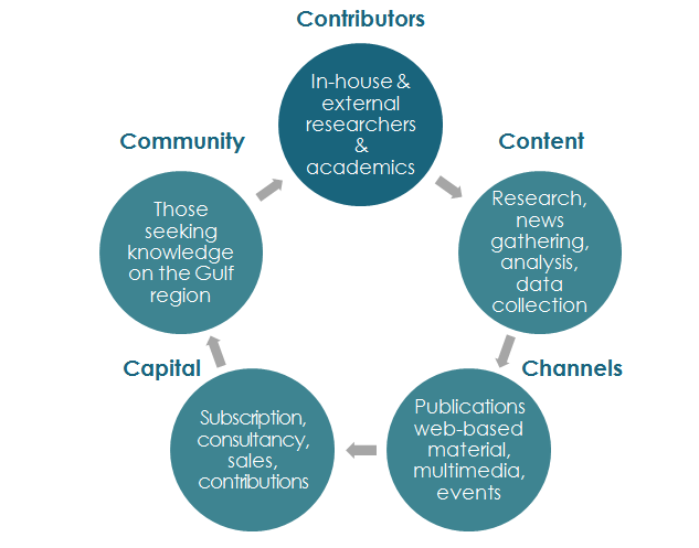 Contributors from within the GRC and its network of experts create the content, which is then disseminated through a variety of channels, and made available to those interested in the study and development of the region. In many cases, members of the community contribute to the Center's research activities, thus completing this creative cycle