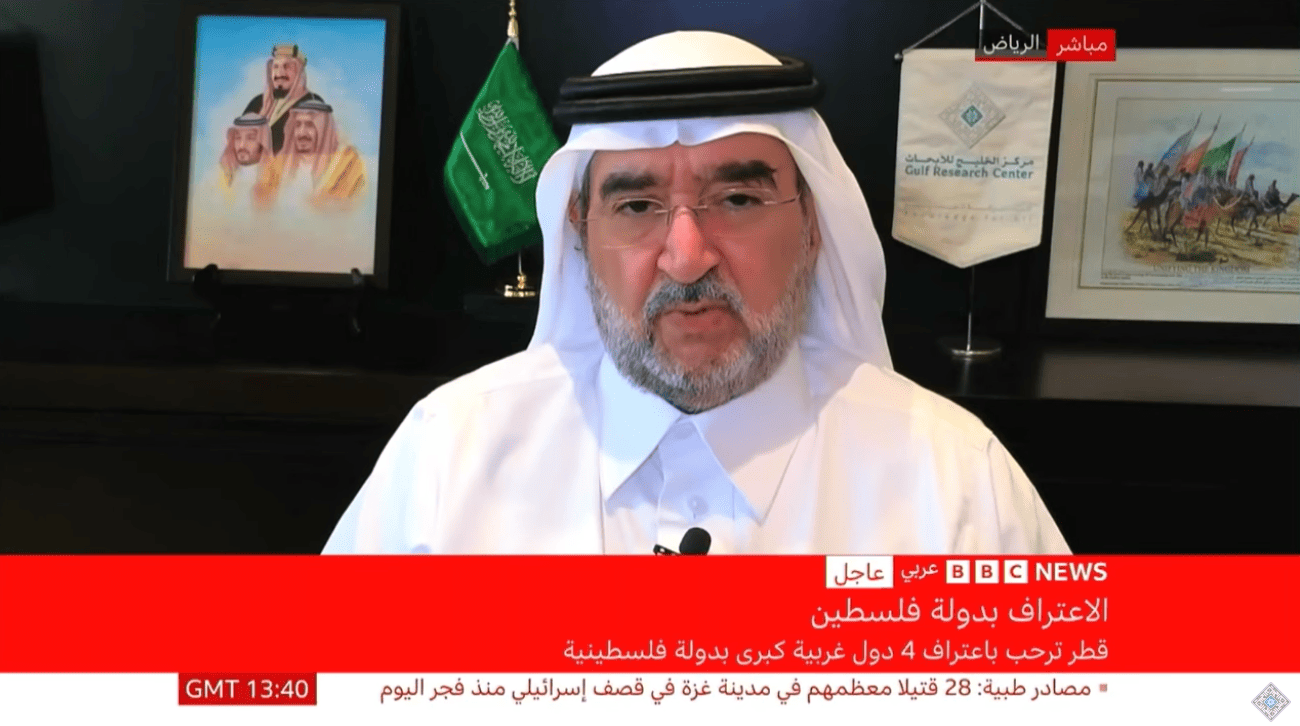 The Chairman of the Gulf Research Center (GRC), Dr. Abdulaziz Sager, participated in an episode of “Afternoon World” airing on BBC News Arabic regarding “the Two-State Solution Conference, co-chaired by Saudi Arabia and France, which took place [on September 22] in New York.”