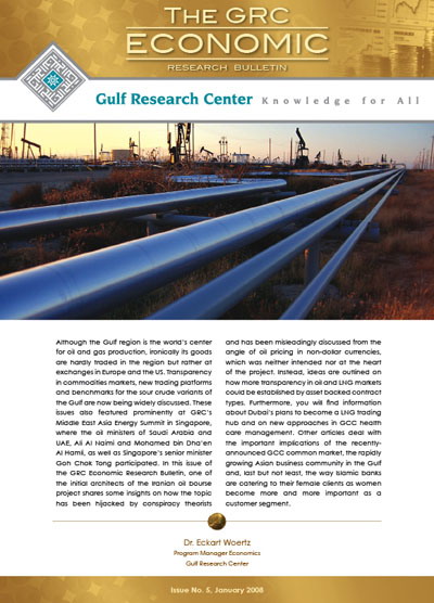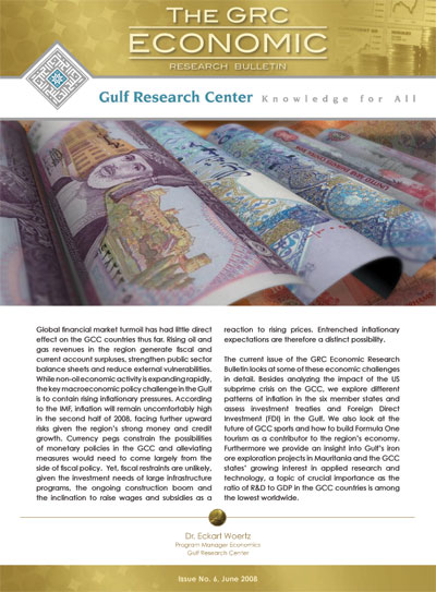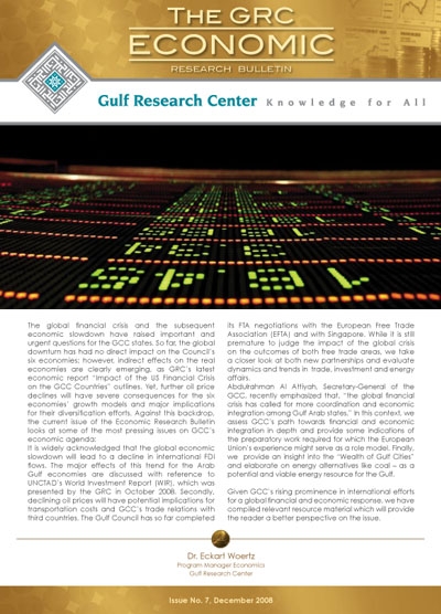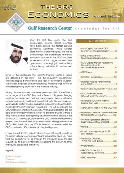Abstract: The GRC Economic Research Bulletin addresses topical issues of economic development in the GCC countries. This inaugural issue discusses the potential for a more balanced and sustainable development of GCC financial markets after the recent stock market corrections. The topics range from regulatory issues, the establishment of bonds and derivatives markets to Islamic banking.