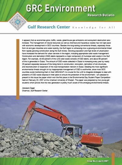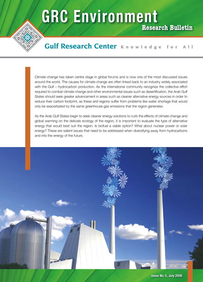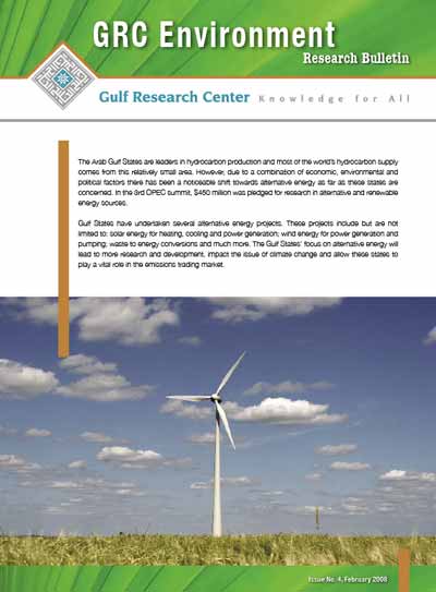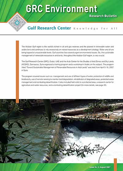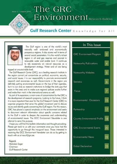 Abstract: The GRC Environment Research Bulletin is a quarterly newsletter that aims to document relevant information about the different environmental challenges and opportunities for the GCC states and their potential impact on the sustainable development of the region. The Gulf region is witnessing increasing stress on its environment and natural resources as a result of rising population, rapid urbanization and industrialization. The Gulf Research Centre is keenly aware of the environmental challenges faced by the GCC states and has launched this research bulletin to deepen the awareness and understanding of environmental issues. The Environment Research Bulletin covers a wide range of environmental issues including, Water, Air, Land, Waste, Biodiversity, marine environment as well as Environmental Policies. The bulletin also showcases activities undertaken by the GRC as part of its environment research program.