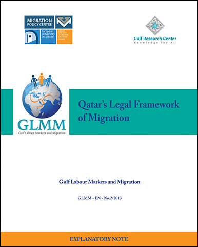 The Gulf Labour Market and Migration (GLMM) programme publishes its second paper: “Qatar’s Legal Framework of Migration” by Maysa Zahra. The paper gives a detailed most up-to-date overview of the legal dimension of migration to Qatar. Over the last decade, Qatar has significantly revised its legal framework in a number of areas that are relevant to the issue of migration. The revision has led to the establishment of rules and regulations that better conform to international standards in areas such as labour rights and human trafficking. However, Qatar’s controversial kefala (sponsorship) system is still a source of concern. This note offers researchers a succinct outline and summary of Qatar’s legal framework on migration. The system of migration-related legislation in the State of Qatar includes the Constitution, international treaties concluded, national laws and by-laws. The GLMM programme produces an array of publications addressing all major issues in different formats. Initially, it focuses on Facts Sheets, Explanatory Notes and Conference Papers. Subsequently, it will add Research Papers, Policy Briefs, Academic Publications as well as Proceedings & Reports. GLMM is an international independent, non-partisan, non-profit joint programme of the Migration Policy Centre (MPC - Florence) and the Gulf Research Center (GRC - Jeddah, Geneva, Cambridge, Tokyo). GLMM provides data, analyses, and recommendations aiming at a better understanding and improved management of Gulf labour markets and migration, engaging with and respecting the viewpoints of all stakeholders. GLMM intends to become an indispensable tool for researchers, students, policymakers, advocates and migrants in, as well as nationals of the GCC countries.