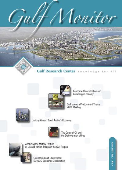 This issue contains articles on the following topics: • Economic Diversification and Knowledge Economy • Gulf Issues a Predominant Theme at G8 Meeting • Looking Ahead: Saudi Arabia’s Economy • The Curse of Oil and the Disintegration of Iraq • Analyzing the Military Posture of US and Iranian Troops in the Gulf Region • Overlooked and Understated: EU-GCC Economic Cooperation