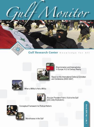 This issue contains articles on the following topics: •Discrimination and Islamophobia in Europe: A 21st Century Reality • Report on the International Defense Exhibition and Conference (IDEX 2007) • When a Militia Is Not a Militia • Russian President Putin’s Visit to the Gulf and Likely Implications • Conceptual Framework for Political Reform • Microfinance in the Gulf