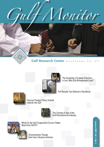 This issue contains articles on the following topics: • Poll Results Test Bahrain’s Resilience. • The Assembly of Experts Elections in Iran: Why Did Ahmadinejad Lose. • Russian Foreign Policy Outlook towards the Gulf. • What Do the Gulf Cooperation Council States Want from NATO. • The Coming of Age of the Gulf Petrochemical Industry. • Environmental Threats from Iran’s Nuclear Activities.