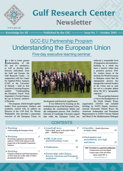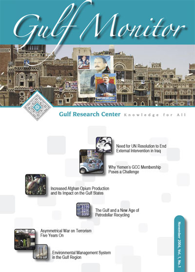 The first issue contains articles on the following topics: • Need for UN Resolution to end external intervention in Iraq • Increased Afghan opium production and its impact on the Gulf States • Why Yemen’s GCC membership poses a challenge • The Gulf and a New Age of Petrodollar Recycling • Asymmetrical War on Terrorism: Five Years On • An Environmental Management System in the Gulf Region