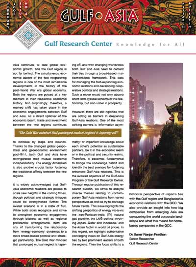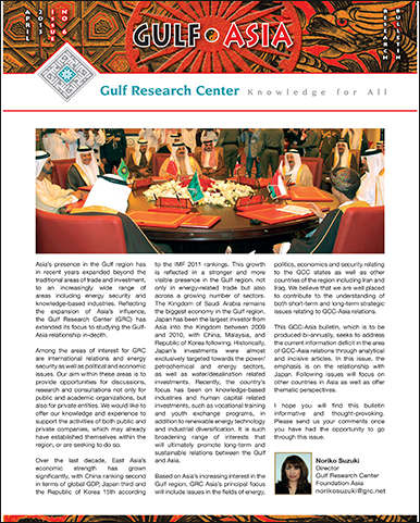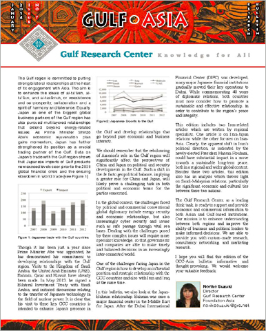 Abstract: This GCC-Asia bulletin, which is to be produced bi-annually, seeks to address the current information deficit in the area of GCC-Asia relations through analytical and incisive articles. In this issue, the emphasis is on the relationship with Japan.