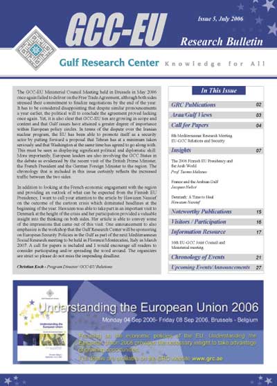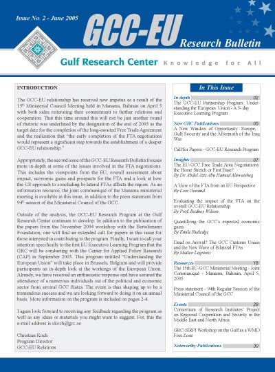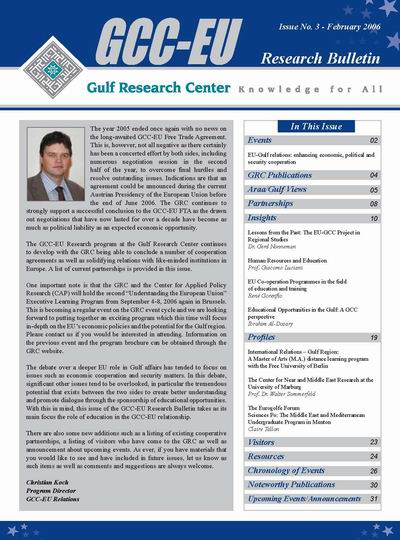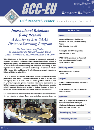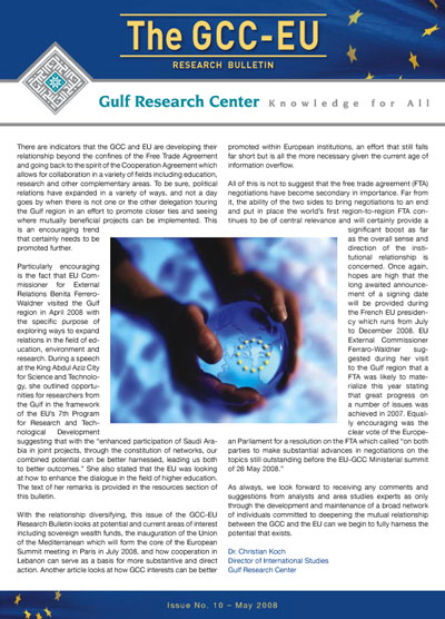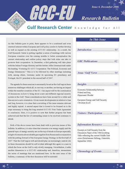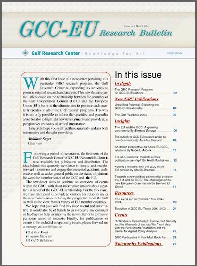 Abstract: The GCC-EU Research Bulletin is a quarterly newsletter focused on the relationship between the member states of the Gulf Cooperation Council (GCC) and the European Union (EU). The newsletter combines an overview of events within the Gulf Research Center with short informative articles on aspects of the GCC-EU relationship as well as useful background information.