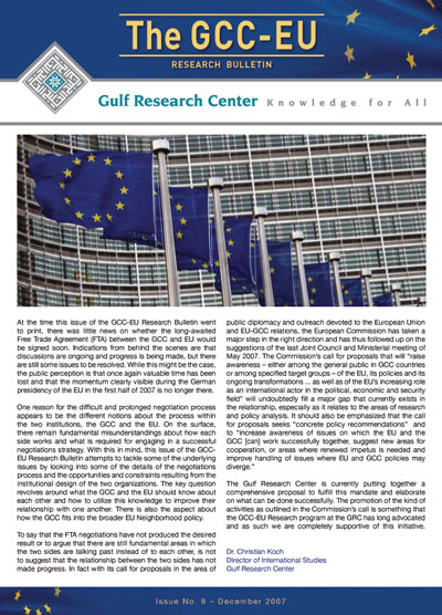 This paper presents a new approach to EU-GCC relations. It is based on a European perspective on the major political and economic developments taking place within the GCC and Iraq. Additionally, it delineates the issues in the relations between the two sides on which there could be more focus. The paper deals with the major aspects of democratization and political reforms in the GCC States, the post-war reconstruction of Iraq, as well as the process of economic growth in this region and the promotion of the role of the private sector as the main driver of development and economic liberalization. It also emphasizes the role of the Gulf commercial bourgeoisie in carrying out these economic activities within the different countries of the region and the Arab World in general. This is quite important a role for initiating the required political change in the future. Also, the paper looks at the most important themes in the ongoing negotiations between the EU and the GCC, including political and security issues, in addition to those of good governance, human rights, human resources and education, trade and investment, oil and gas supplies, stock exchange and financial markets.