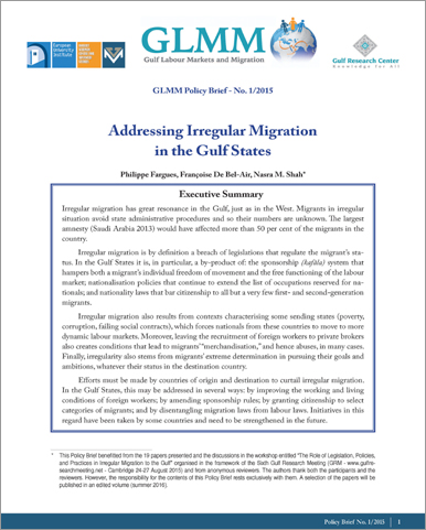 Irregular migration has great resonance in the Gulf, just as in the West. Migrants in irregular situation avoid state administrative procedures and so their numbers are unknown. The largest amnesty (Saudi Arabia 2013) would have affected more than 50 per cent of the migrants in the country. Irregular migration is by definition a breach of legislations that regulate the migrant’s status. It also results from contexts characterising some sending states, such as poverty, which forces nationals from these countries to move to more dynamic labour markets. Efforts must be made by countries of origin and destination to curtail irregular migration. In the Gulf States, this may be addressed in several ways: by improving the working and living conditions of foreign workers; by amending sponsorship rules; by granting citizenship to select categories of migrants; and by disentangling migration laws from labour laws. Initiatives in this regard have been taken by some countries and need to be strengthened in the future.