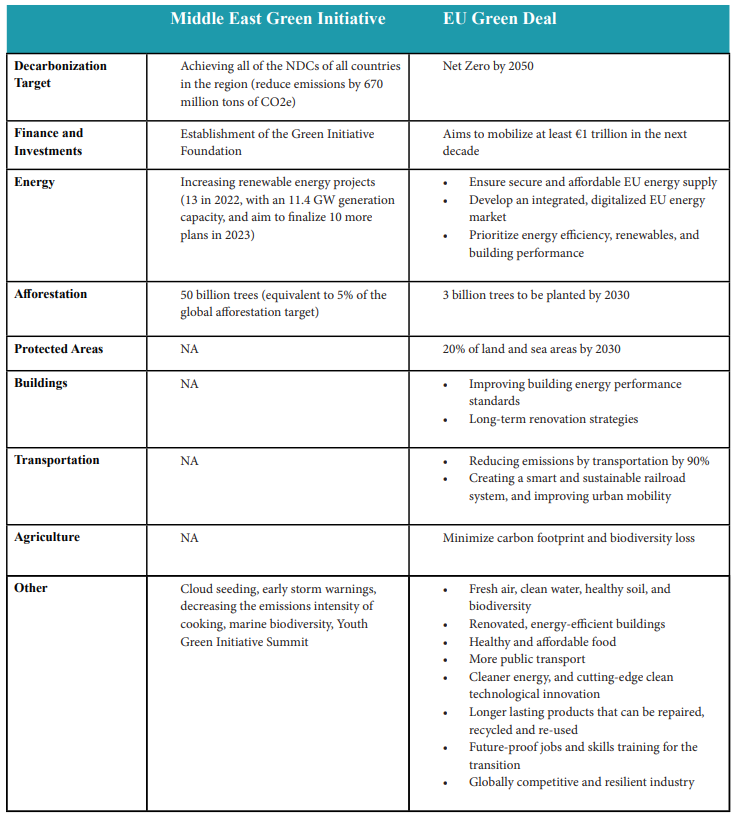 The Middle East Green Initiative and the EU Green Deal share similarities in that they are both regional initiatives aimed at decarbonizing their respective regions. The Saudi and Middle East Initiatives and the EU Green Deal thus offer comprehensive strategies that address sustainability from various dimensions including climate, energy, and biodiversity. Additionally, these regions have related initiatives that are relevant to each region such as the carbon capture technology for the Gulf and reducing consumption in Europe.