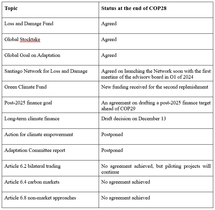 Attended by more than 97,000 participants, the 2023 United Nations Climate Change Conference (COP28) in Dubai came to an end on December 13, 2023. The two-week international climate summit produced numerous important outcomes. While some items on the agenda did not see final decisions, promising progress has been made on climate justice, energy transition, agricultural resilience, food security, and a wide range of other sectors closely associated with the 1.5ºC target set in the Paris Agreement (see Table 1). With historic consensus achieved on moving away from fossil fuels, the key challenge awaiting future climate actions will be in terms of the implementation of decision made in Dubai.