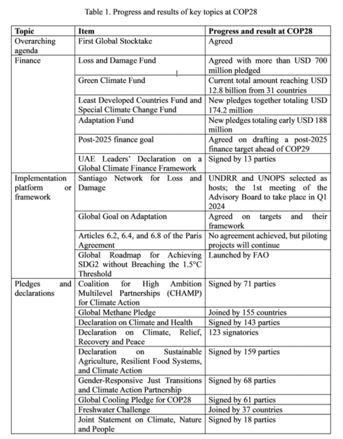 The international climate summit yielded fruitful outcomes (see Table 1). First and foremost, as an overarching agenda that covers a wide range of climate issues, the first Global Stocktake (GST) was successfully passed by COP28 President Dr. Sultan Al Jaber. It resulted in the monumental “UAE Consensus” among almost 200 countries, a highlight of which is an unprecedented mention of shifting away from fossil fuels in the current energy system. Second, the Conference enabled a successful enforcement of the Loss and Damage Fund established at COP27 in Egypt as well as witnessed a surge in the amount pledged to existing financial mechanisms. For instance, the Green Climate Fund gained new contributions from six countries and reached a record of 12.8 billion from 31 countries. The Least Developed Countries Fund and the Special Climate Change Fund hosted by the Global Environment Facility received USD 141.74 million and USD 32.5 million respectively in Dubai, which is significantly higher compared to the amount pledged in Sharm El-Sheikh in 2022. New contributions totaling USD 187.7 million were made to the Adaptation Fund to empower adaptation solutions in vulnerable countries and communities. Third, several key platforms and roadmaps for implementing climate ambitions were advanced or created, including the Santiago Network for Loss and Damage established at COP25, the Global Goal on Adaptation under Article 7.1 of the Paris Agreement, and the Global Roadmap for Achieving SDG 2 without breaching the 1.5°C threshold launched by the Food and Agriculture Organization of the United Nations (FAO). Last but not least, a few initiatives managed to attract more participants, and multiple new declarations were signed by parties from various sectors associated with climate change, including agriculture, nature conservation, health, gender equality, peacebuilding, etc.