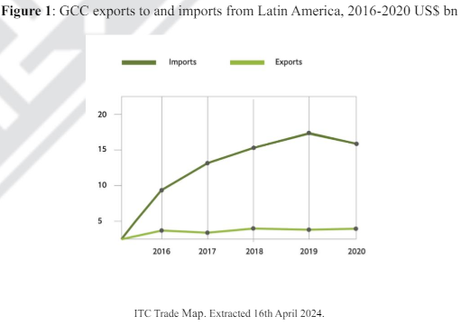 Despite facing connectivity limitations of geographical distance and a lack of cultural ties, the formal exchanges between the GCC and Latin America saw a notable surge in trade in the 2010s. Gulf states saw an increase in imports from Latin America, with significant contributions coming from Brazil, Mexico, Chile, and Argentina. By 2015, Argentina secured the second spot in trade among Latin American countries, closely trailed by Mexico in third place. Notably, Ecuador emerged as the fourth significant player in trade with Gulf countries through 2014-2015. Trade between Latin America and the GCC experienced significant growth (see figure 1), especially in imports, which notably increased from 2016 to 2019. During this period, imports into the GCC from Latin America increased substantially, rising from $9.6 billion in 2016 to $17.2 billion in 2019, before declining to $15.4 billion in 2020. These imports predominantly comprised primary goods, including gold, meat, iron ore, cereals, sugar, and coffee.