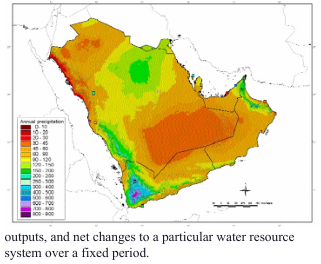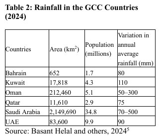 The GCC countries have low and irregular rainfall, typically less than 100 mm-yr and as low as 50 mm-yr in the northern and central parts of the region. This region is arid, and its countries already fall well below the water scarcity line as defined by the World Health Organization -WHO- -having renewable water resources less than 1000 m3/yr/capita-.