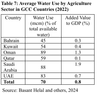 Action is needed for improving water-use efficiency in both agriculture and domestic sectors. Still, agricultural policies do not encourage rational water use, although this sector contributes an insignificant proportion of GDP, which causes an inordinate share of the agriculture sector in the over-exploitation of this valuable resource. The main challenge for policy makers in the GCC countries is reducing the unsustainable rate of groundwater mining for use in agriculture, in addition to making agriculture more competitive.