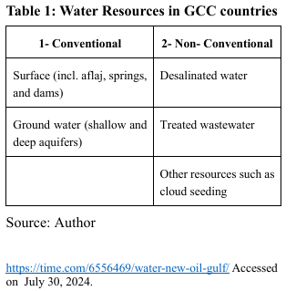 Water resources in GCC countries can be classified into two main categories: Conventional and Non-Conventional, as shown in table 1 below. A detailed explanation will follow in the next sections for each type of water source.