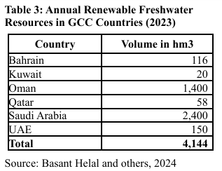 The annual renewable surface water, desalinated capacity, and wastewater treatment capacity in the GCC countries are estimated at 4.14, 26.4, and 10.07 billion m3 respectively. The average per capita water consumption is around 550 l/d (2023) as shown in Table 3. The GCC countries have high water footprints.
