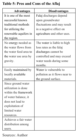 conditions and conveys it to the ground surface by gravity. The falaj system suits the social and cultural conditions of rural areas in arid and semi-arid zones. The continuous water flow from many aflaj overtime is proof of their efficiency, suitability, and sustainability to the hydrologic environment in the Arab region. A summary of pros and cons of the aflaj is shown in Table 5.