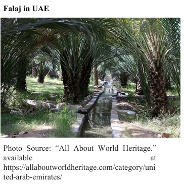 characteristics. The aflaj system still operates in some parts of the UAE and Oman and offers many economic and environmental benefits. A falaj is a channel that may be open or partially or completely covered. The channel collects groundwater through natural infiltration.