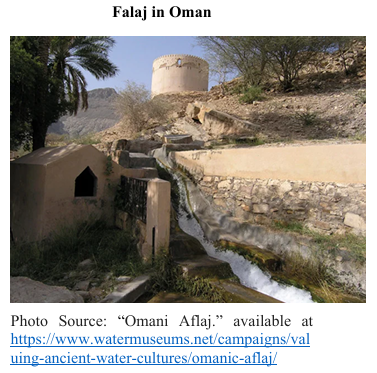 Aflaj is the plural for falaj. The term “falaj” represents an irrigation system that includes economic, social, cultural, and managerial.