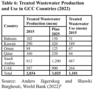 Wastewater treatment in the Gulf region constitutes an increasing water source driven by escalating water consumption in urban areas. The total wastewater treated and reused in 2015 and plan for 2025 in the GCC countries is shown in Table 6.