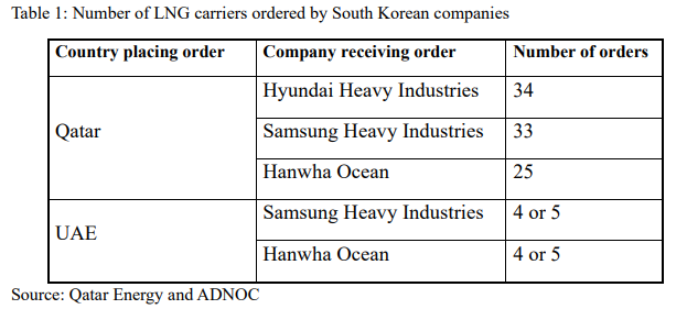As mentioned above, the procurement of new LNG carriers has been dominated by South Korean companies, with the majority of conventional carriers ordered by Qatar and the UAE (102 out of a maximum of 114) set to be built by Korean shipbuilders. In response to the GCC countries’ plans to increase LNG production, South Korea has actively promoted its LNG carrier production capacity and advanced technological capabilities to Qatar and the UAE. This proactive approach has played a key role in securing these shipbuilding contracts for South Korean companies.