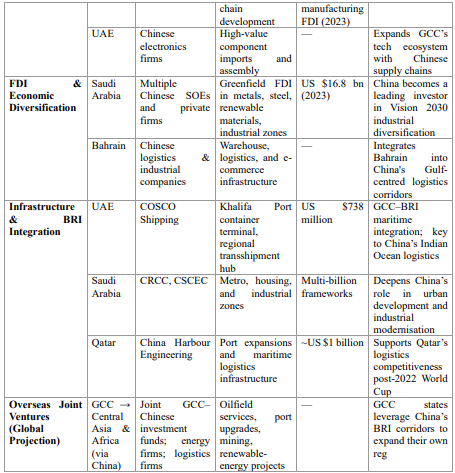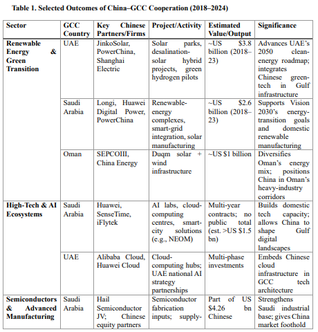 These projects demonstrate that China–GCC cooperation has already moved well beyond hydrocarbons into high-value domains—including advanced manufacturing, digital infrastructure, renewable energy, and global joint ventures. Chinese firms are now embedded in the Gulf’s longterm industrial and technological transitions, while GCC states increasingly leverage the BRI to expand their influence into Central Asia and Africa. Collectively, this deepens structural interdependence between China and the Gulf and positions the GCC pillar as a central vector of China’s global economic projection.